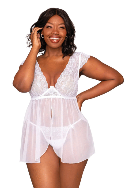 The Sheer Lace Babydoll Set becomes an instant angel look — especially with a halo and soft-glow makeup. Sweet, soft, and picture-perfect for anyone who loves a playful aesthetic.