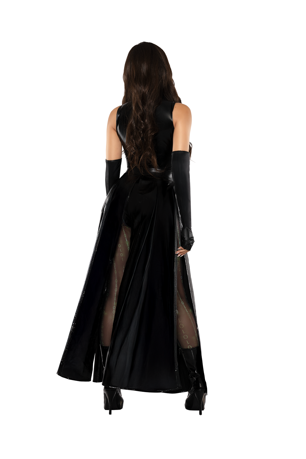 Coated denier jumpsuit with zip-front and printed mesh leg