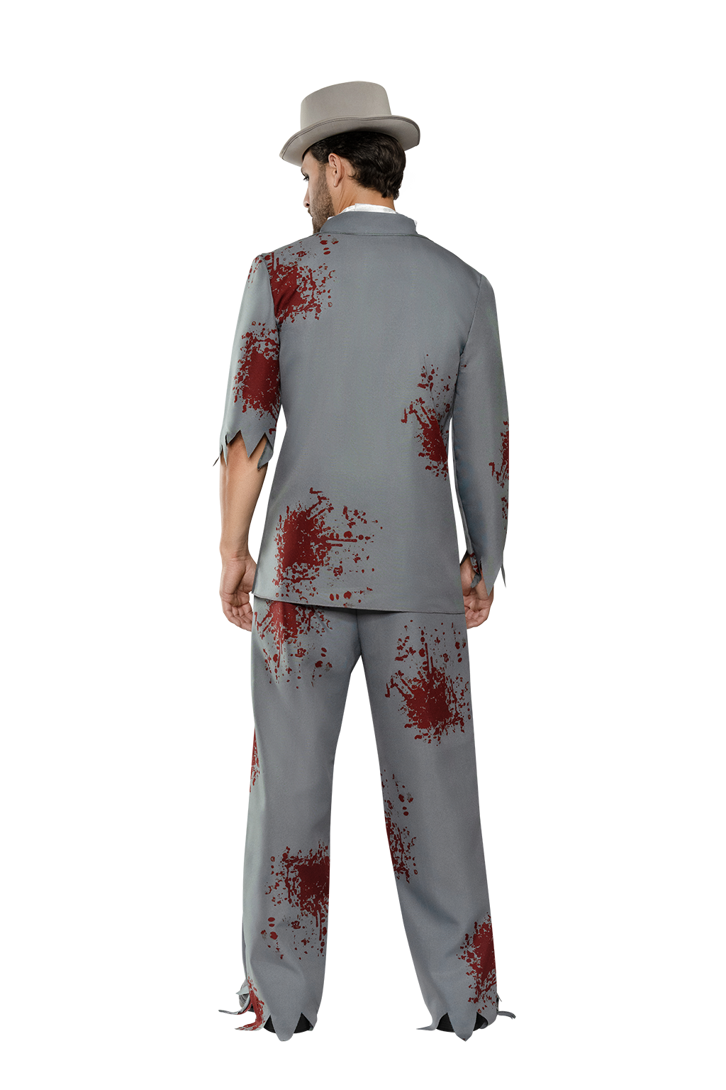 Printed polyester jacket and pant combo with dagged hems. Includes velvet hat and satin dickey-style shirt with velvet detailing. 9505 construction.