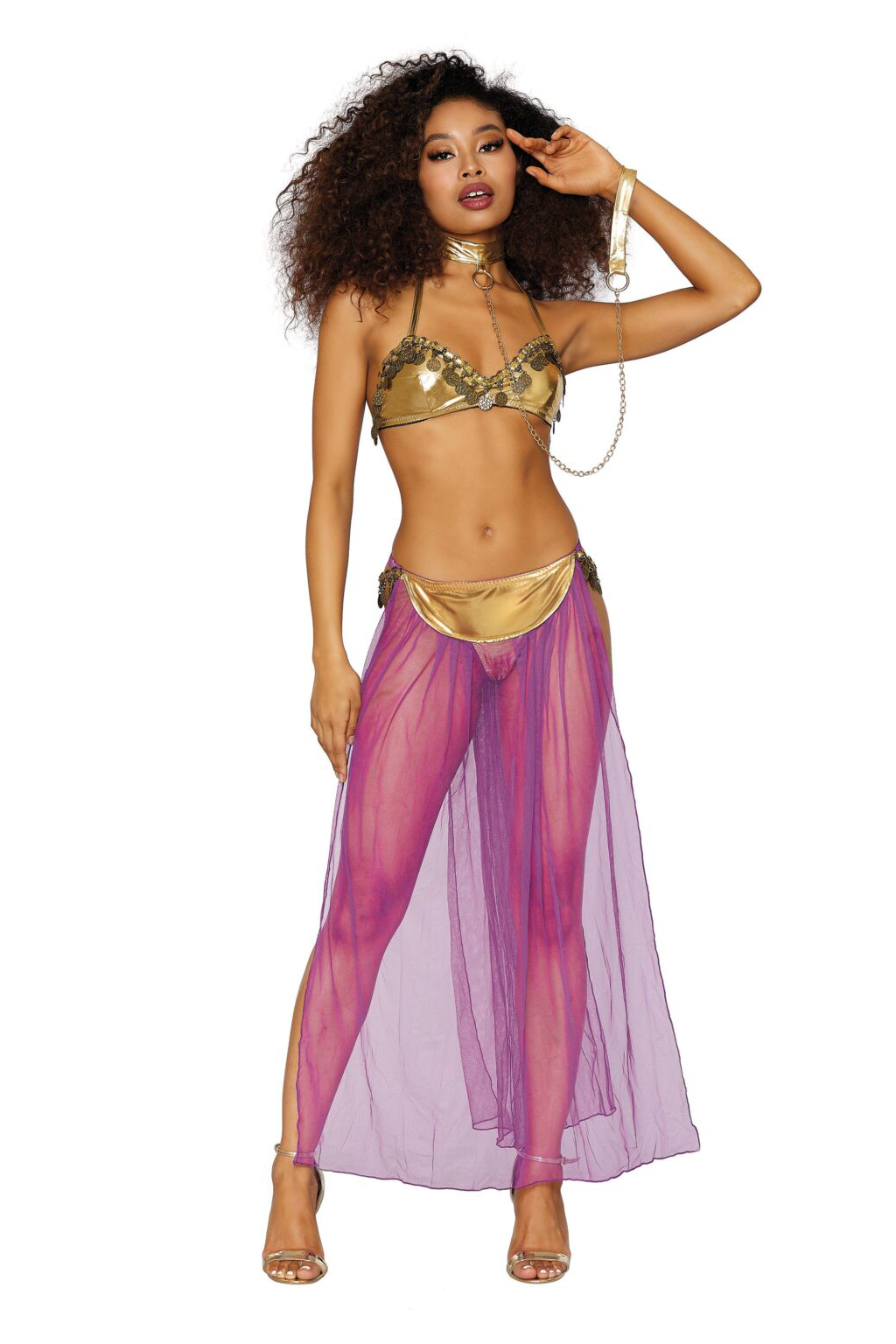 Gold lamé halter bra with gold coin trim and adjustable back ties; matching thong with attached long mesh skirt with open sides and coin trim detail. Matching neck collar with chain leash included.