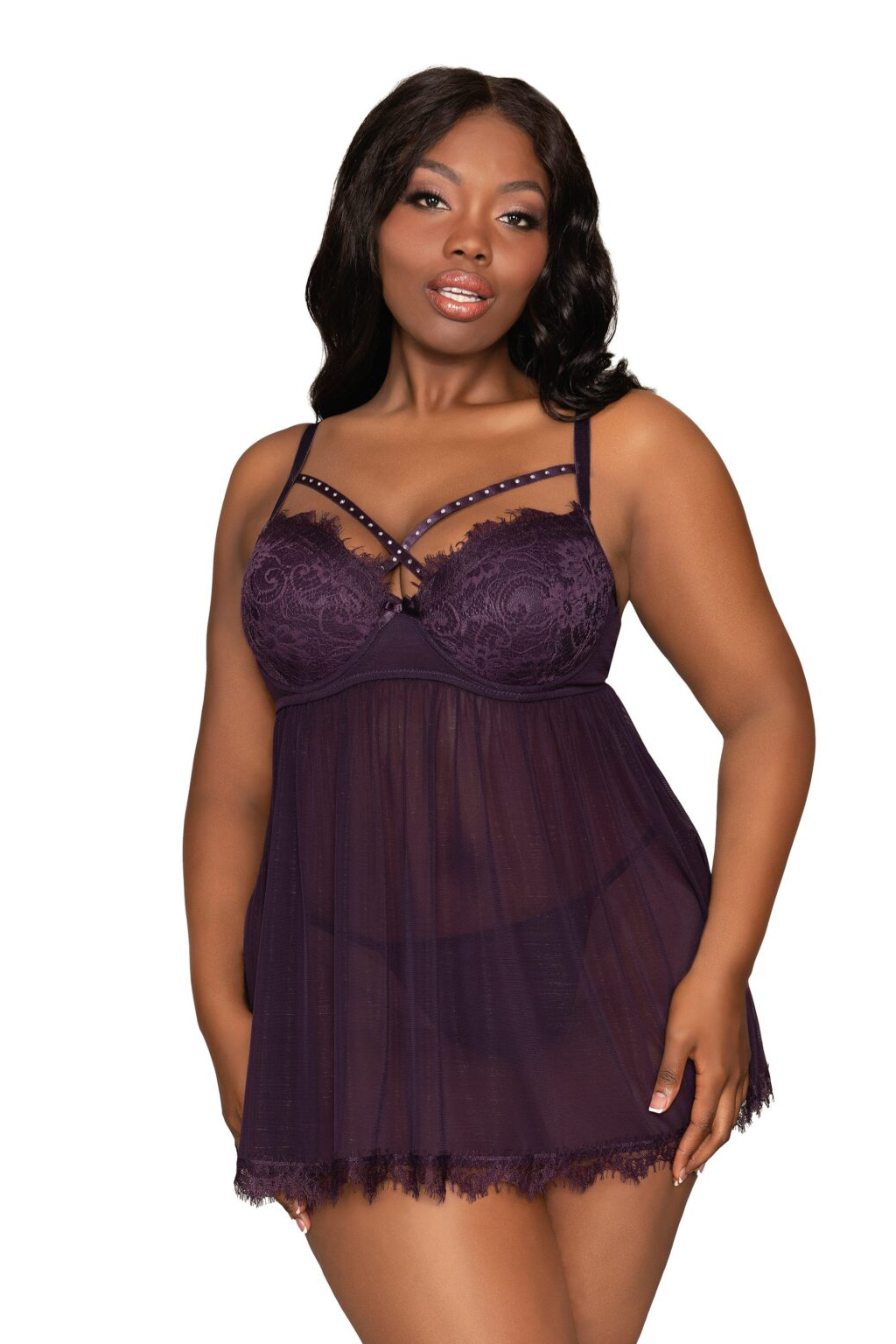 Eyelash Lace and Mesh Babydoll Set with Strappy Rhinestone Neckline Plus Size