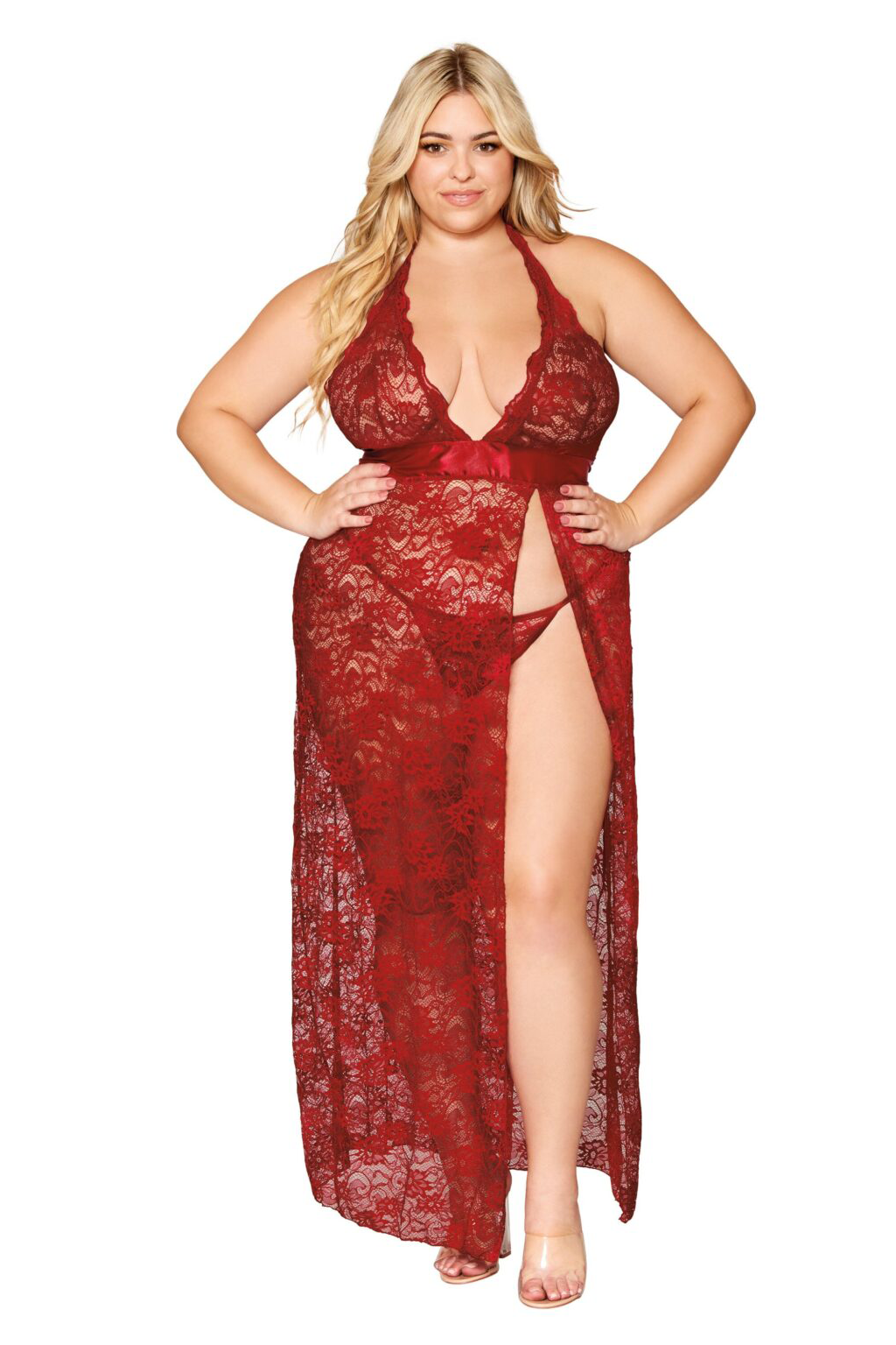 - Ensemble Highlights: The ensemble focuses on the lace halter gown’s elegance, emphasizing its key features and adjustable design, accompanied by a matching G-string for a complete look.