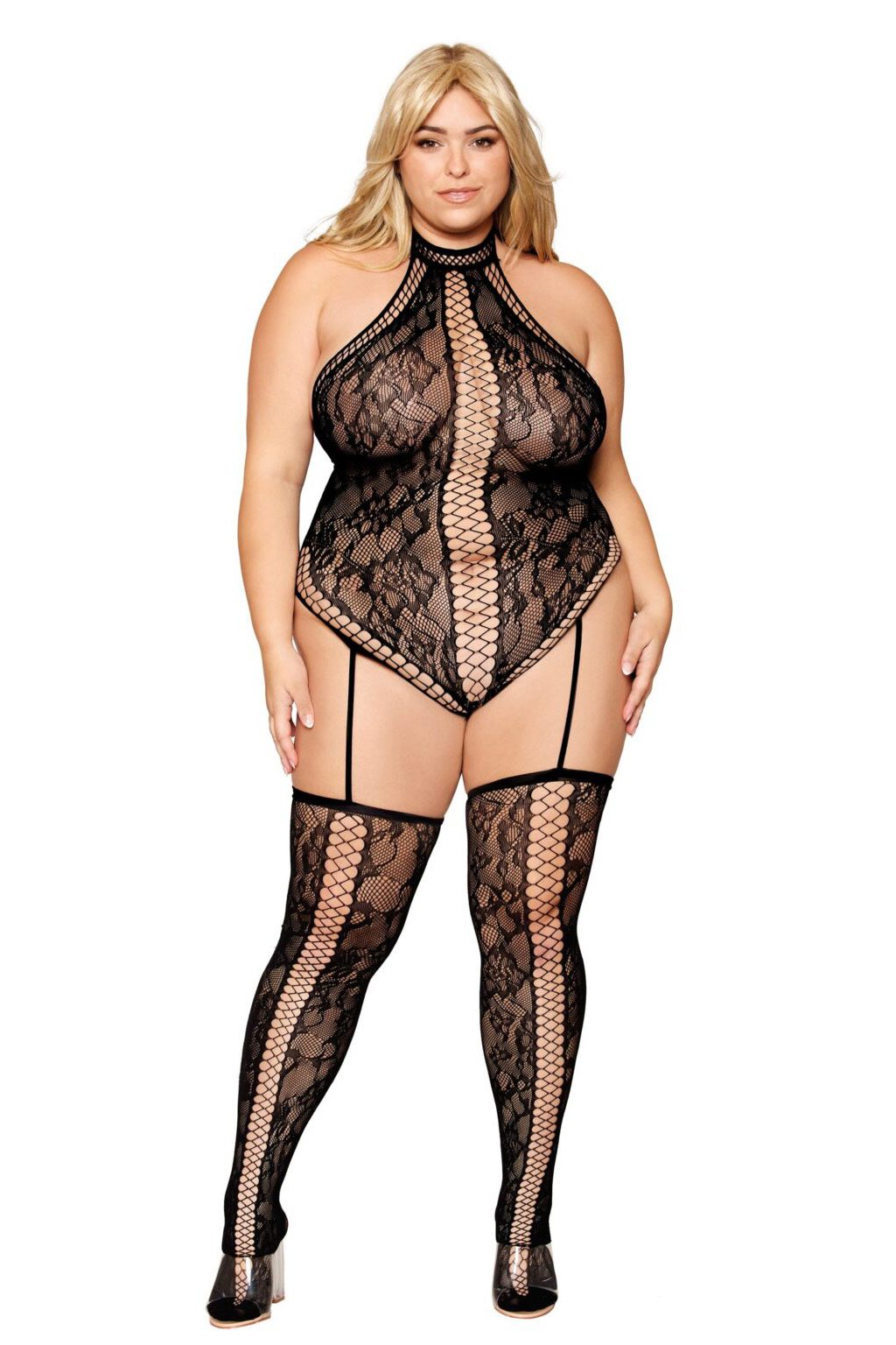 Plus-sized lace teddy bodystocking with criss-cross details with attached garters and matching thigh-high stockings.