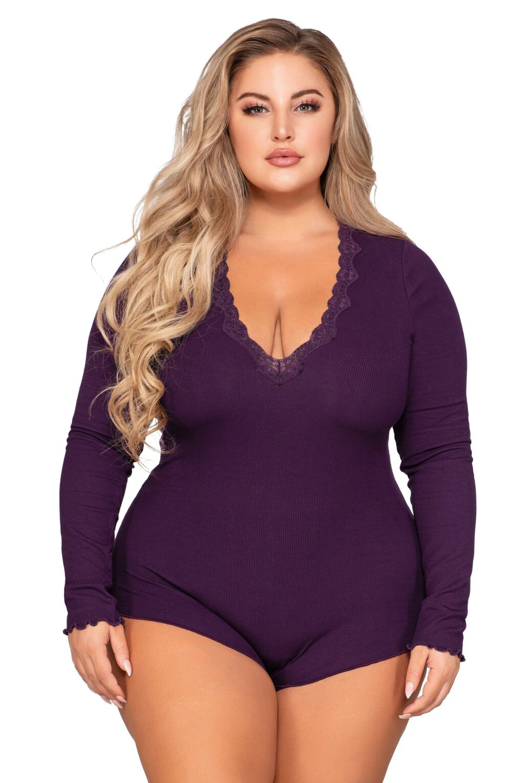 Plus size stretch rib knit sleepwear romper with plunge neckline, stretch lace trim & lettuce edge hem.