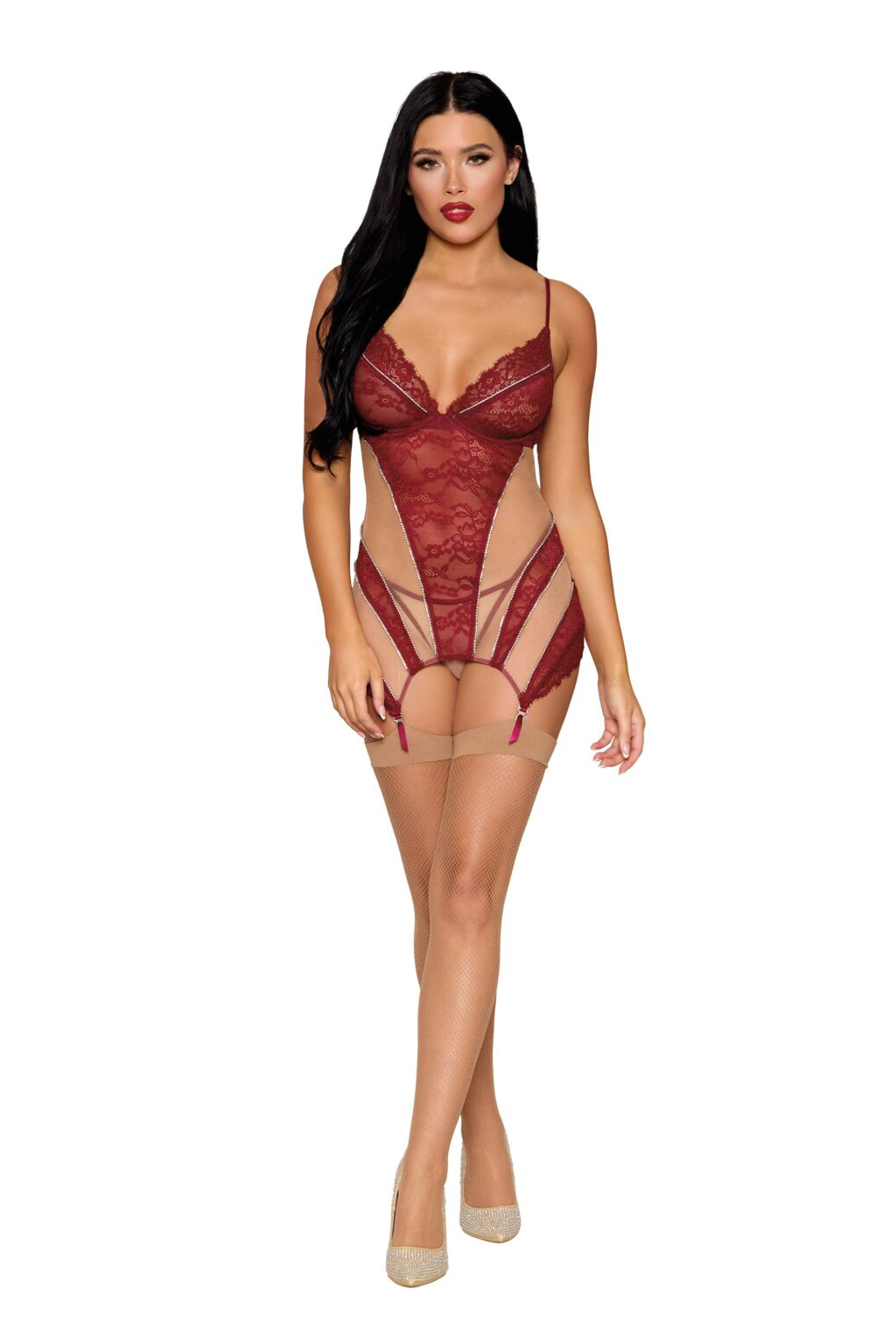 - Stretch lace and ultra sheer nude mesh garter slip and G-string with snag-free rhinestone seaming details